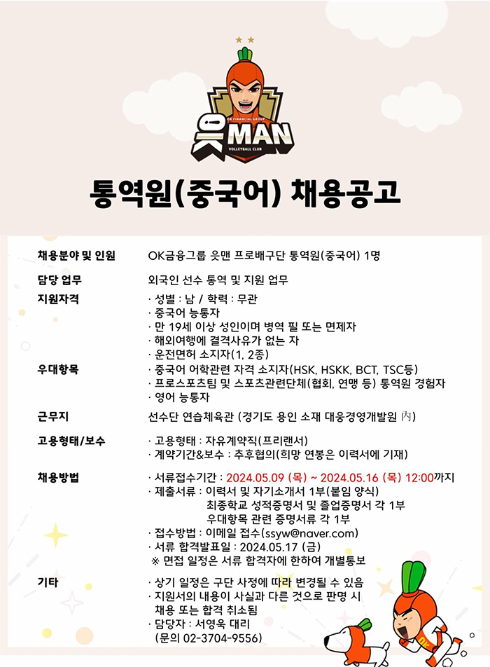 [OK금융그룹 읏맨 프로배구단] 통역원(중국어) 채용 공고